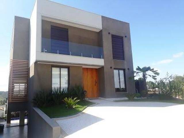 'Casa de 490 m² de área construída, com 4 suítes, living integrado a cozinha, adega, sala de TV, lavabo, lavanderia, suíte área de serviço, academia, sauna úmida, piscina, aquecimento solar (para piscina e chuveiros), cisterna água fluvial nas descargas, vão para elevador de carga.