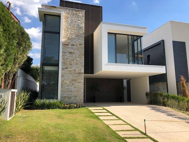 'Casa de 340 m² de área construída, com 4 suítes (suíte máster com iluminação zenital no banheiro / quarto da frente com pé direito duplo - permite decoração criativa como instalação de brinquedões para crianças ou dois níveis), pé direito duplo no living, cozinha gourmet integrada ao living, podendo ser separada por portas de correr ou paredes, dependência de empregada, lavabo, escritório, tudo com ar condicionado, 2 vagas de garagem coberta e com área de lazer (piscina com prainha, lareira a gás ou elétrica - lareira de 7 mt altura de pedra-madeira, jardim vertical com 200 vasos, sistema de timer digital controlando os dias, horários e duração da irrigação.