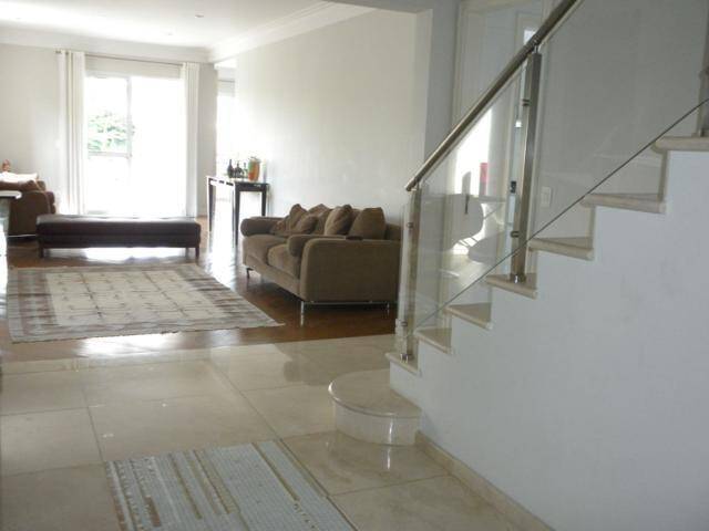 'Bela casa de 480 m² de área construída, com 4 suítes, 3 vagas de garagem coberta, piscina, churrasqueira, sauna e vestiário.