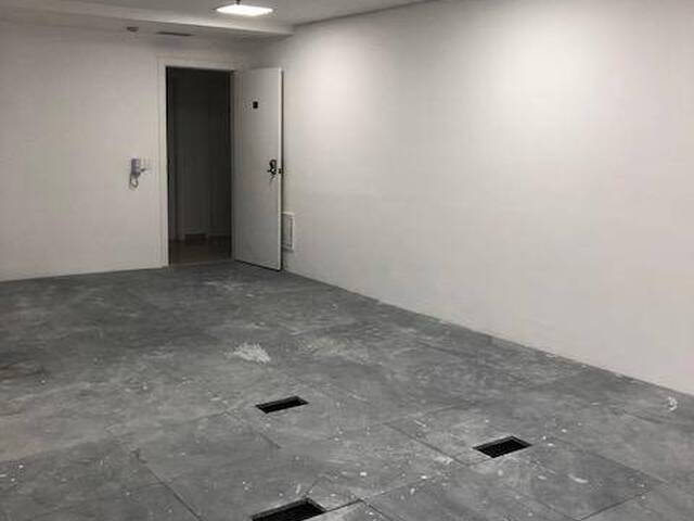 'Sala comercial de 42 m², com piso elevado, ar condicionado.