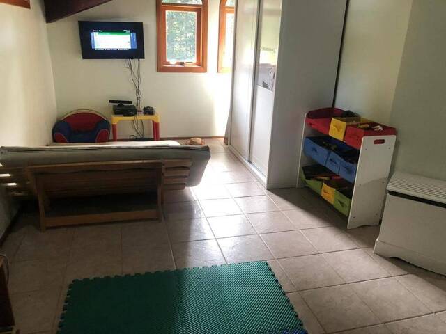 4 suítes (do casal com hidromassagem), living composto de 3 amplas salas (lareira, varanda para jardim externo e jardim interno), escritório, brinquedoteca, cozinha, despensa.