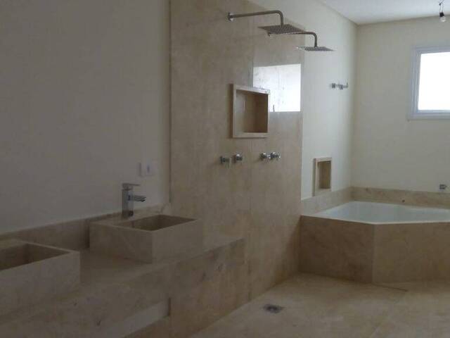 A casa possui finíssimo acabamento em mármore importado Crema Marfil na área interna, porcelanato Porto Bello na área externa, louças e metais Roca e Deca, imponente porta de entrada com 4,20m de altura, ar condicionado (infra) em todos os ambientes - exceto cozinha e sala de almoço, aspiração central (infra), esquadrias em PVC, automação residencial e reservatório para águas pluviais.
